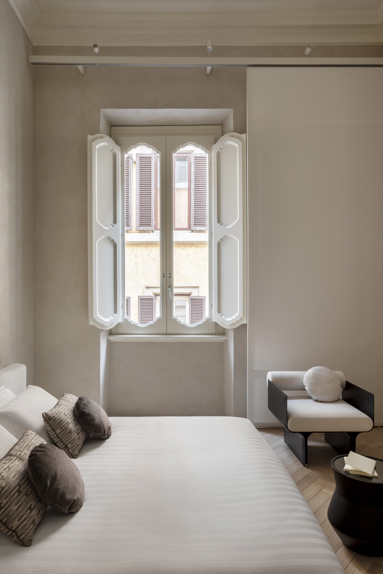 Gli intonaci in calce dalle cromie calde tipiche di Roma, il parquet di rovere a spina italiana e i bagni rivestiti in travertino romano creano un ambiente dove l'antico dialoga armoniosamente con arredi contemporanei. Una perfetta sintesi tra eredita storica e comfort moderno.