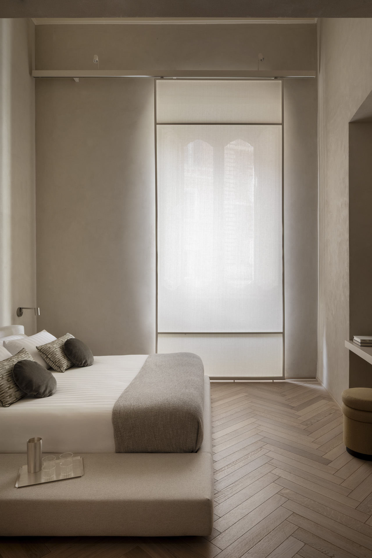 Le camere Superior di Hotel Trame offrono 30-40 mq di comfort contemporaneo nel cuore di un palazzo cinquecentesco. Ogni camera presenta soffitti a cassettoni con decorazioni floreali originali, riscoperte dopo quasi settant'anni sotto i controsoffitti dello storico negozio Tessuti Bassetti.